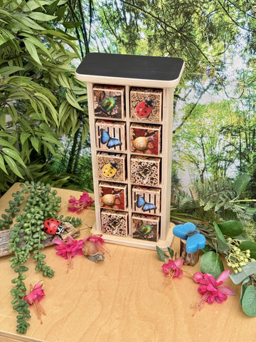 - Set contains one Bug Hotel 10-Frame with ten solid pine bug cubes.