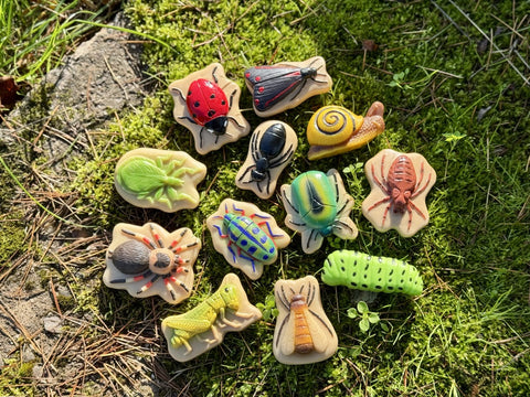 - Set of twelve bug stones: ant, caterpillar, grasshopper, honey bee, ladybird/bug, leaf bug, moth, rainbow shield bug, scarab beetle, snail, spider, and tarantula.